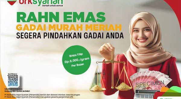 PEKANBARU – PT Bank Riau Kepri Syariah (Perseroda) menyediakan pembiayaan Rahn Emas (Gadai Emas) dengan limit maksimal sebsar Rp250 juta dengan jangka waktu paling lama 4 bulan. Biaya penyimpanan emas (ujrah) yang ditawarkan sangat murah, hanya Rp.6.000 per gram/bulan.